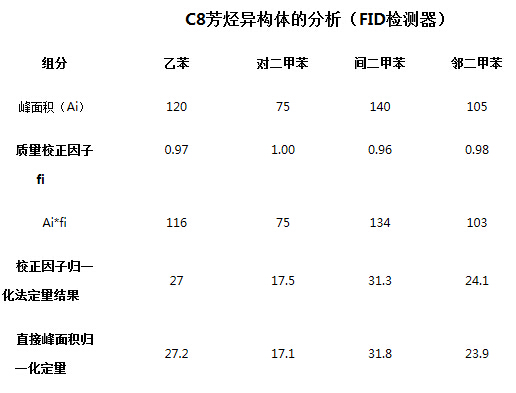 氣相色譜的一些主要檢測器如FID和TCD對某些組分,如同系物的校正因子相近或有一定的規(guī)律,從文獻中可以查到或進行計算。當校正因于相近時,可直接用峰面積歸一化進行定量分,例如下表中給出了C8芳烴異構體的分析結果。四個組分的FID檢測器的質量校正因子在0.96-1.00之間,結果給出了用校正因子進行歸一化法的定量結果和直接用峰面積進行歸一化的定量結果。