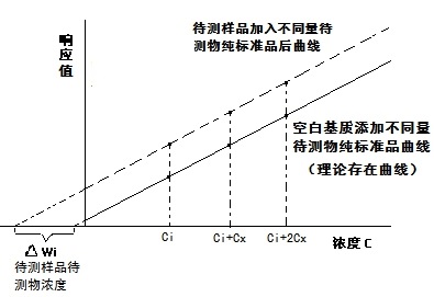 具體操作是取等量待測樣品若干份,加入不同濃度的待測組分的標準溶液進行分析,以濃度為橫坐標,峰面積為縱坐標繪制工作曲線。工作曲線延長線在橫坐標上的截距即為樣品中待測組分的濃度。由于待測組分以及加入的標準溶液處在相同的樣品基體中,相當于把待測試樣作為了背景值。
