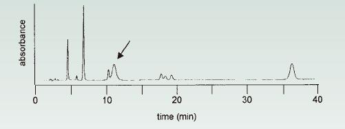 圖11.峰延遲洗脫通常在38.5分鐘時出現(xiàn)(遲洗脫峰(正常情況下在第38.5分鐘出現(xiàn)的洗脫峰)),位于(出現(xiàn)在了)下一個縮短的等度運(yùn)行的色譜圖的12.0分鐘(箭頭)處。來源[6]。