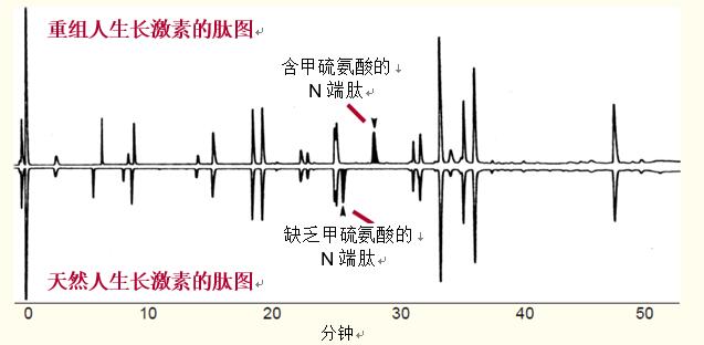 圖33對重組人生長激素(在大腸桿菌中表達(dá))的肽圖和天然人生長激素(缺乏甲硫氨酸)的肽圖進(jìn)行了比較。
